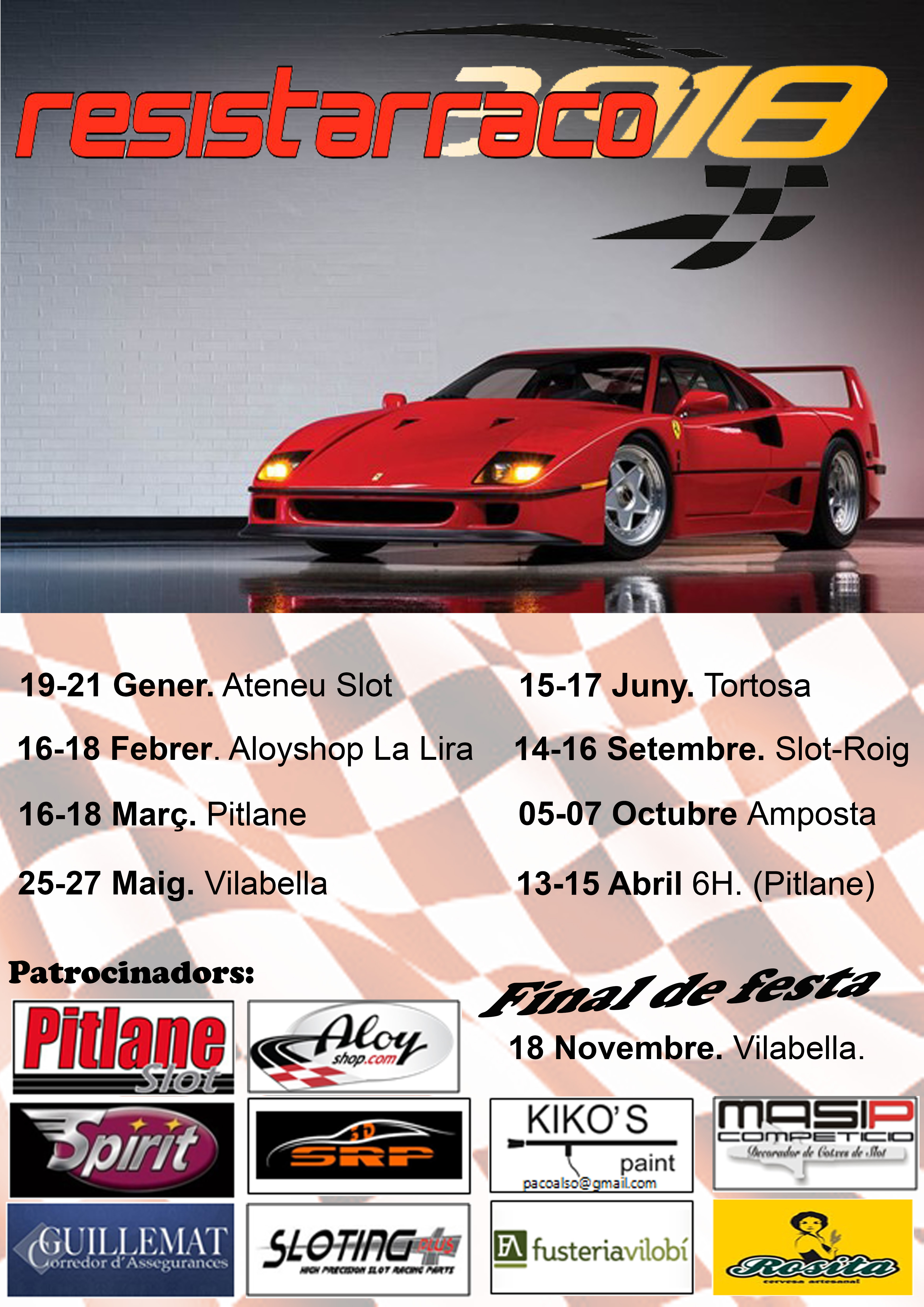 Resistarraco 2018 CLASSIFICACIÓ GENERAL 2018: Classificació general ENTREGA DE PREMIS 2018: Crònica final de festa Galeria d'imatges Estadístiques Resistarraco 2018 Historial Resistarraco 2009-2018 1- ATENEU SLOT VILAFRANCA (19 al 21 de Gener) Resultats Crònica Galeria d'imatges 2- ALOYSHOP LA LIRA (16 al 18 de Febrer) Resultats Crònica Fotos 3- PITLANE SLOT REUS (16 al 18 de Març) Resultats Crònica Galeria d'imatges 4- SLOT 6H (13 al 15 d' Abril) Resultats Crònica Galeria d'imatges 5- SLOT VILABELLA (25 al 27 de Maig) Resultats Crònica Galeria d'imatges 6- SLOT TORTOSA (15 al 17 de Juny) Resultats Crònica Galeria d'imatges 7- SLOT MONT-ROIG (14 al 16 de Setembre) Resultats Fotos. Crónica. 8- SLOT AMPOSTA (05 al 07 d'Octubre) Resultats. Fotos. Crónica.